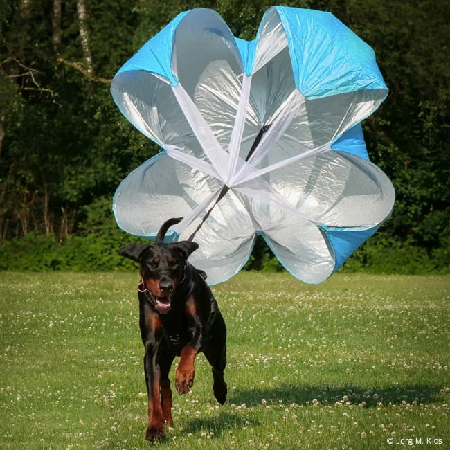 Unsichere Hunde könnten den “Verfolger”-Fallschirm im ersten Moment als “Bedrohung” empfinden. Wir empfehlen daher einen ersten Test in einem eingezäuntem Gelände.