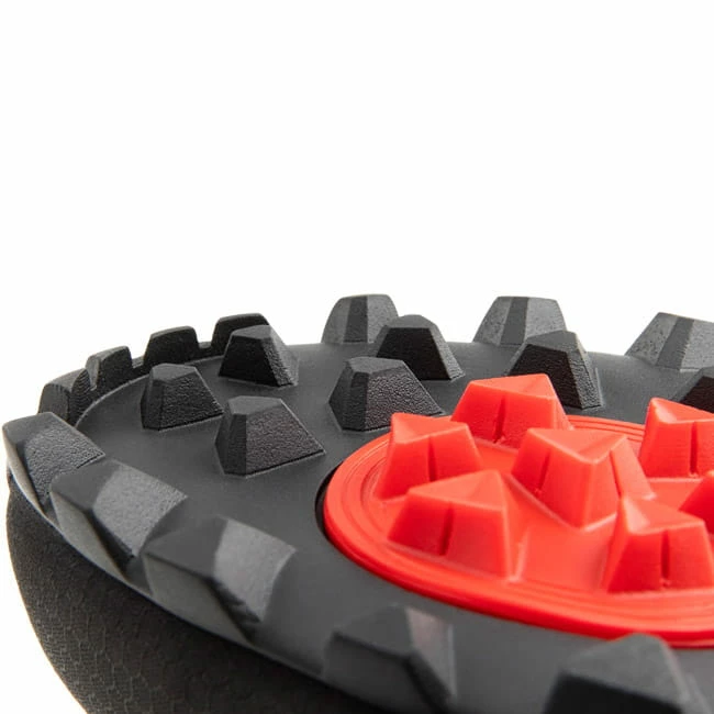 abriebfest, aggressives Noppenprofil, nach außen gestellt, besserer Grip auf weichem, nassem oder lockerem Untergrund,