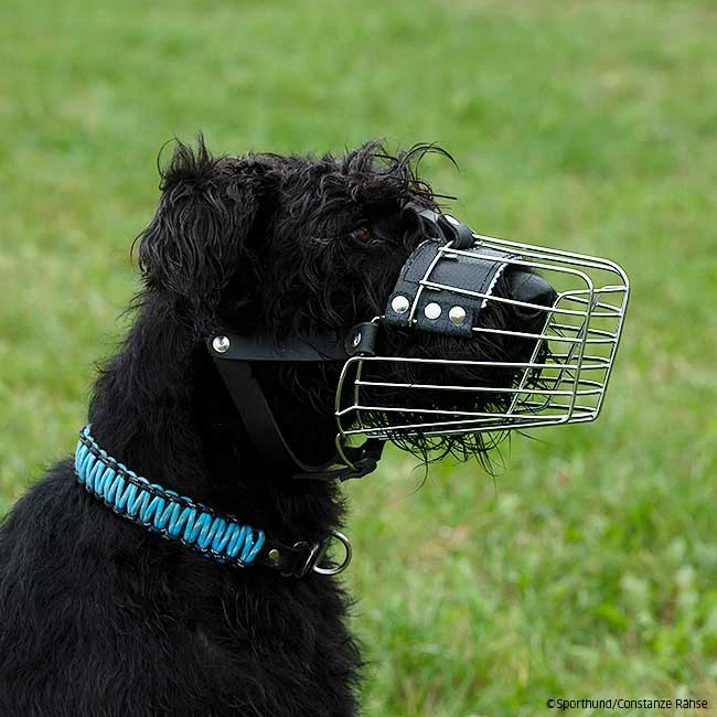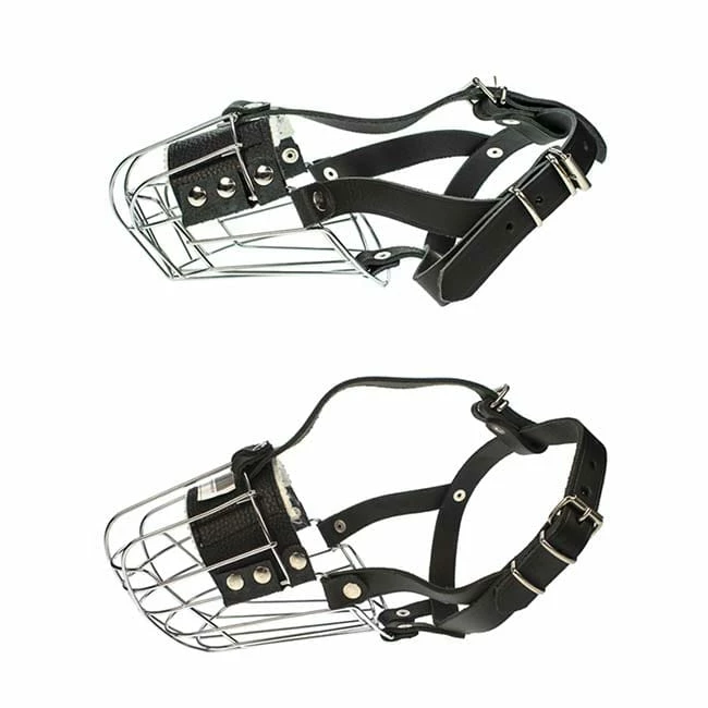 Stabiler Maulkorb bestehend aus einem Drahtkorb mit vernieteten Lederriemen. Ein zusätzlicher Riemen, der die Stirn hoch verläuft und sich in den zweiten Riemen einfädeln lässt, sorgt dafür, dass der Hund den Maulkorb nicht so einfach abstreifen kann. Am oberen Teil ist der Korb mit einer leichten Polsterung unterlegt, die das Wundreiben vermeidet.
