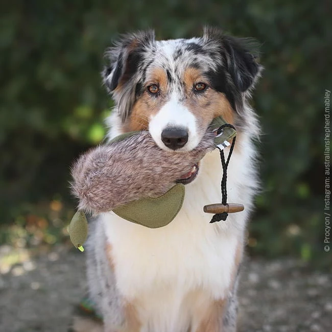 Schwimmfähiger Dummy in Entenform mit Kunstfellüberzug und einem Wurfband.