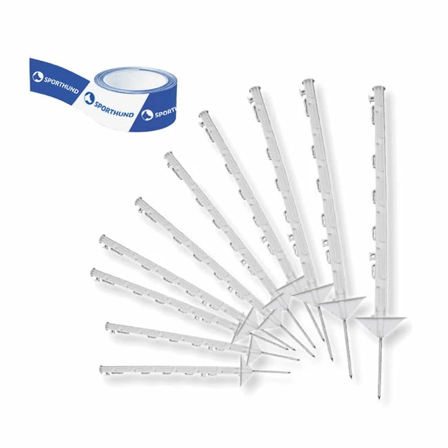 Unser Longier-Starterset besteht aus dem besonders robusten Sporthund-Absperrband und 10 Stäben. Die Stäbe sind 74 cm hoch und verfügen über einen Erdspieß mit Eintritt-Hilfe. Das Absperrband kann in 5 verschiedenen Höhen einfach eingeführt werden. Dadurch können in der Lernphase auch mehrere Bänder gespannt werden. Das macht es dem Hund einfacher.