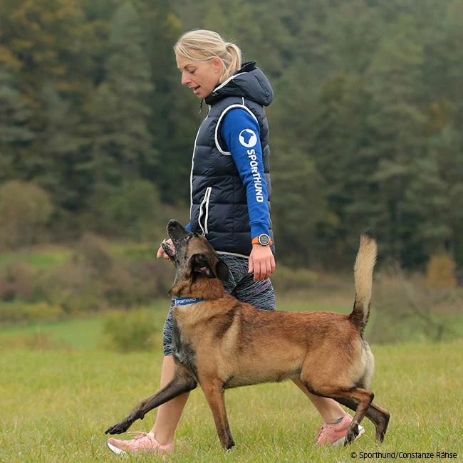 Die Maritime Weste mit Stick Sporthund ist eine modische Steppweste mit angeschnittener Kapuze.