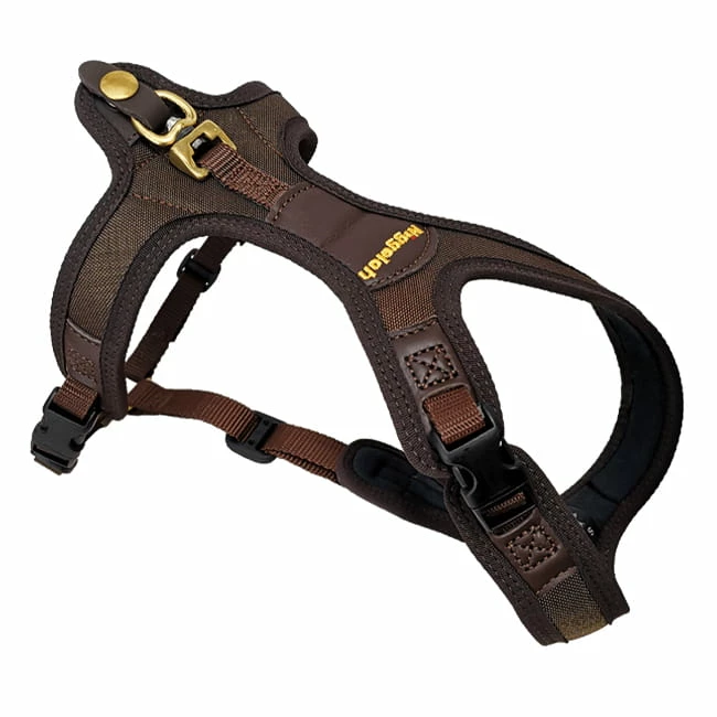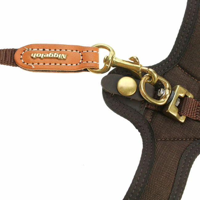 Drehwirbel zur Leinenbefestigung an der Oberseite bei den Größen XS, S, M. Messing D-Ring bei der Größe XXS.
