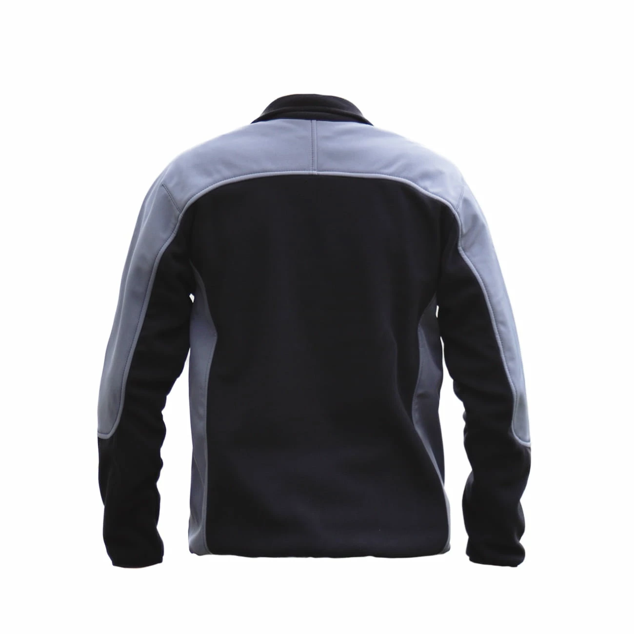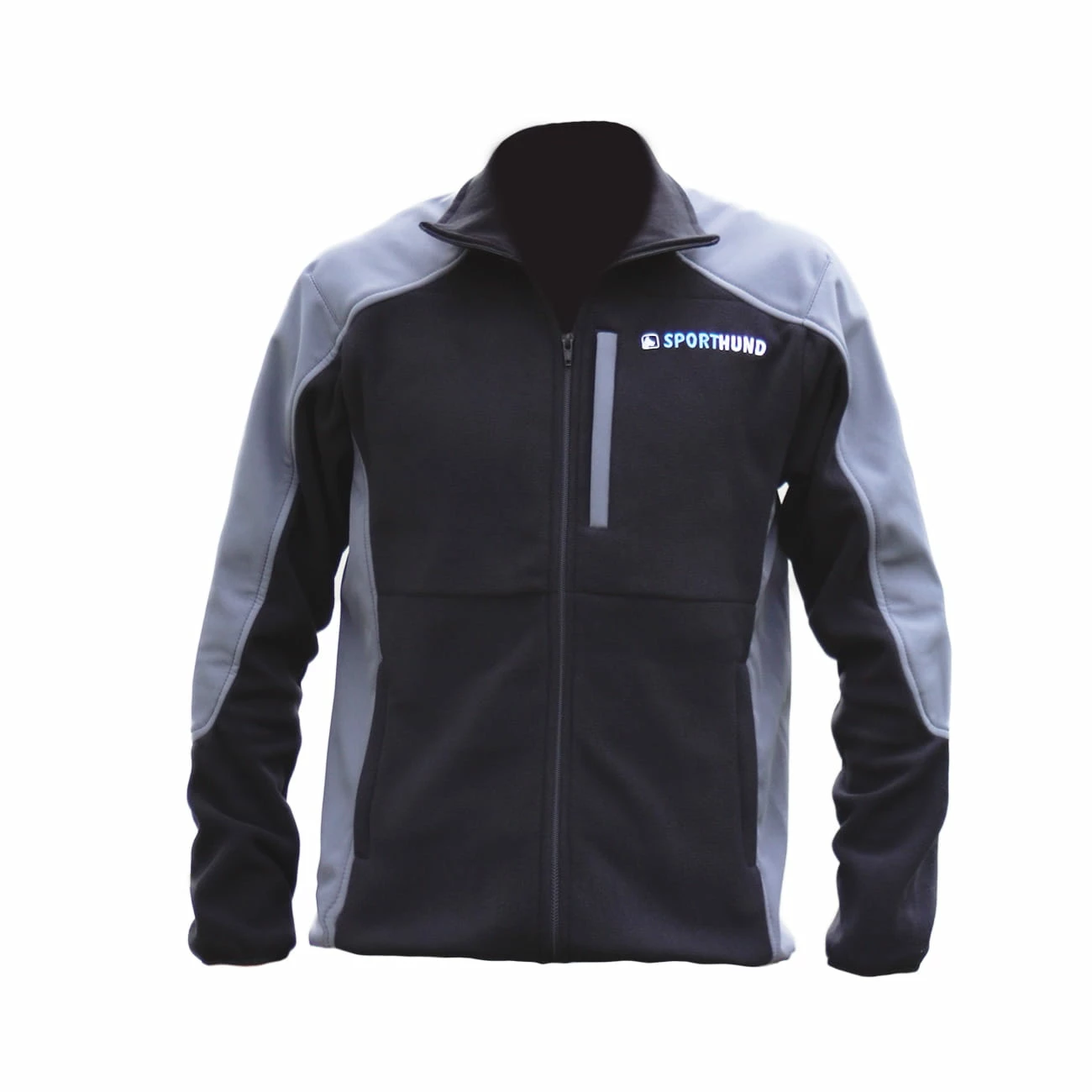 Moderne Fleece Jacke mit Softshell Einsätzen in grau-schwarz mit Sporthund Logo.