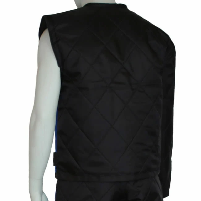 Die Jacke ist seitlich mit einem blauen Streifen abgesetzt.
