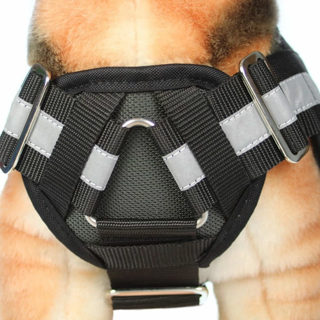 Die breite, gepolsterte Brustplatte ist durch drei breite Gurte mit dem Geschirr verbunden. So wird der aufgebaute Druck perfekt verteilt. Dank 5 Verstellmöglichkeiten kann das Geschirr perfekt dem Hundekörper angepasst werden. Der hochwertige und gummierte Griff sorgt für sicheren Halt. Dank der beidseitigen Clickverschlüsse lässt sich das Geschirr sehr einfach anlegen.